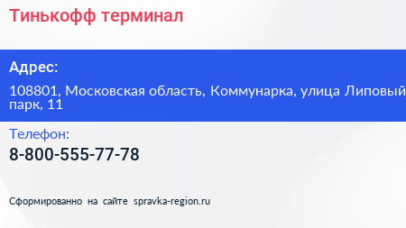 Тинькофф, терминал по адресу 108801, Московская область, Коммунарка, улица Липовый парк, 11 в дальнейшем Организация, размещена в следующих категориях: