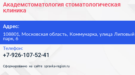 Академстоматология, стоматологическая клиника по адресу 108801, Московская область, Коммунарка, улица Липовый парк, 6 в дальнейшем Организация, размещена в следующих категориях: