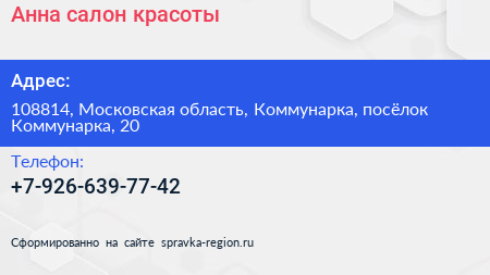 Анна, салон красоты по адресу 108814, Московская область, Коммунарка, посёлок Коммунарка, 20 в дальнейшем Организация, размещена в следующих категориях: