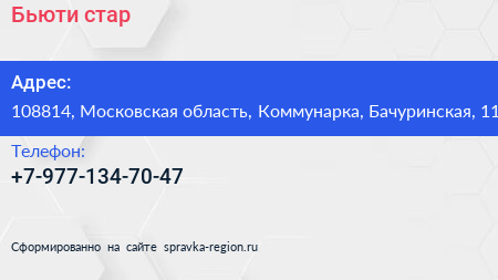 Бьюти стар по адресу 108814, Московская область, Коммунарка, Бачуринская, 11 в дальнейшем Организация, размещена в следующих категориях: