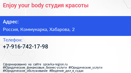 Enjoy your body, студия красоты по адресу Торгово-развлекательный комплекс "Новомосковский", 2, улица Хабарова, Филимонковский район, Московский, Москва, Центральный федеральный округ, 142784, Россия в дальнейшем Организация, размещена в следующих категориях:
