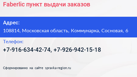 Faberlic, пункт выдачи заказов по адресу 108814, Московская область, Коммунарка, Сосновая, 6 в дальнейшем Организация, размещена в следующих категориях: