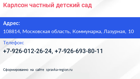 Карлсон, частный детский сад по адресу 108814, Московская область, Коммунарка, Лазурная, 10 в дальнейшем Организация, размещена в следующих категориях: