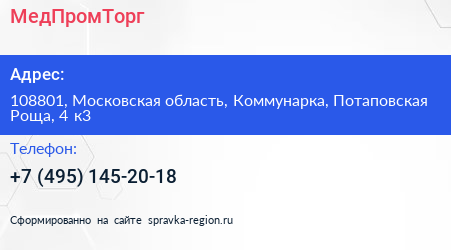 МедПромТорг по адресу 108801, Московская область, Коммунарка, Потаповская Роща, 4 к3 в дальнейшем Организация, размещена в следующих категориях: