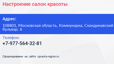 Настроение, салон красоты по адресу 108801, Московская область, Коммунарка, Скандинавский бульвар, 6 в дальнейшем Организация, размещена в следующих категориях: