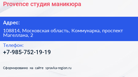 Provence, студия маникюра по адресу 108814, Московская область, Коммунарка, проспект Магеллана, 2 в дальнейшем Организация, размещена в следующих категориях: