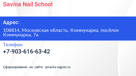 Savina Nail School по адресу 108814, Московская область, Коммунарка, посёлок Коммунарка, 7а в дальнейшем Организация, размещена в следующих категориях: