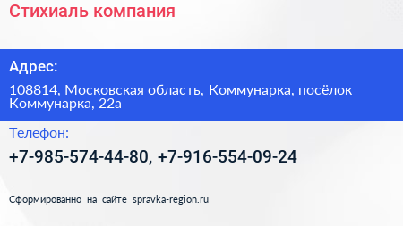 Стихиаль, компания по адресу 108814, Московская область, Коммунарка, посёлок Коммунарка, 22а в дальнейшем Организация, размещена в следующих категориях: