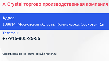 A-Сrystal, торгово-производственная компания по адресу 108814, Московская область, Коммунарка, Сосновая, 1в в дальнейшем Организация, размещена в следующих категориях: