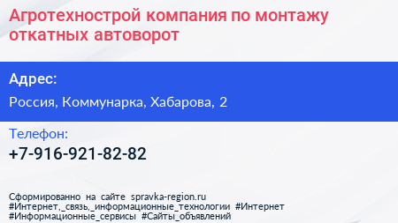 Агротехнострой, компания по монтажу откатных автоворот по адресу Торгово-развлекательный комплекс "Новомосковский", 2, улица Хабарова, Филимонковский район, Московский, Москва, Центральный федеральный округ, 142784, Россия в дальнейшем Организация, размещена в следующих категориях: