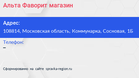 Альта Фаворит, магазин по адресу 108814, Московская область, Коммунарка, Сосновая, 1Б в дальнейшем Организация, размещена в следующих категориях: