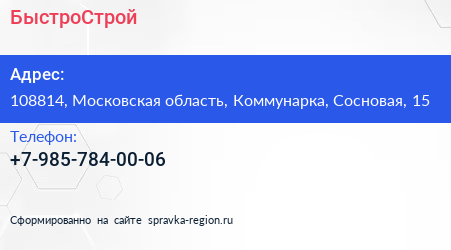 БыстроСтрой по адресу 108814, Московская область, Коммунарка, Сосновая, 15 в дальнейшем Организация, размещена в следующих категориях: