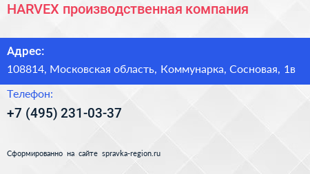 HARVEX, производственная компания по адресу 108814, Московская область, Коммунарка, Сосновая, 1в в дальнейшем Организация, размещена в следующих категориях: