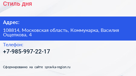 Стиль дня по адресу 108814, Московская область, Коммунарка, Василия Ощепкова, 4 в дальнейшем Организация, размещена в следующих категориях: