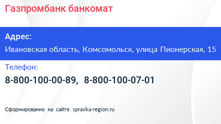 Газпромбанк, банкомат по адресу Ивановская область, Комсомольск, улица Пионерская, 15 в дальнейшем Организация, размещена в следующих категориях: