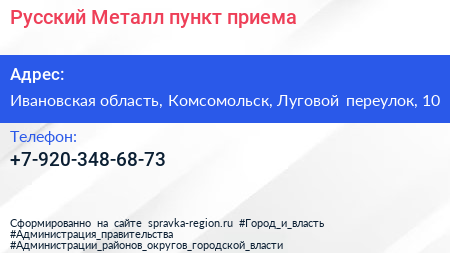 Русский Металл, пункт приема по адресу Ивановская область, Комсомольск, Луговой переулок, 10 в дальнейшем Организация, размещена в следующих категориях: