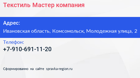 Текстиль Мастер, компания по адресу Ивановская область, Комсомольск, Молодежная улица, 2 в дальнейшем Организация, размещена в следующих категориях: