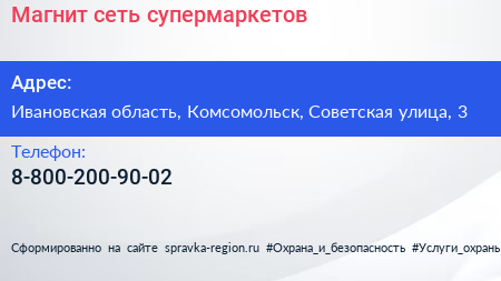 Магнит, сеть супермаркетов по адресу Ивановская область, Комсомольск, Советская улица, 3 в дальнейшем Организация, размещена в следующих категориях: