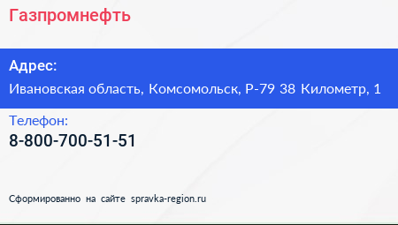 Газпромнефть по адресу Ивановская область, Комсомольск, Р-79 38 Километр, 1 в дальнейшем Организация, размещена в следующих категориях: