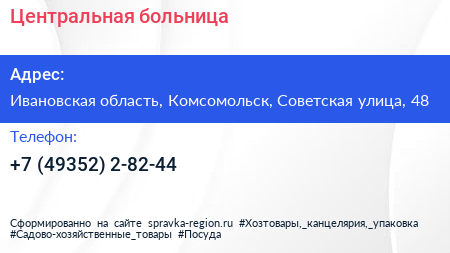 Центральная больница по адресу Ивановская область, Комсомольск, Советская улица, 48 в дальнейшем Организация, размещена в следующих категориях: