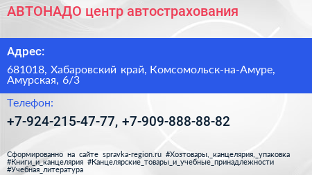 АВТОНАДО, центр автострахования по адресу 681018, Хабаровский край, Комсомольск-на-Амуре, Амурская, 6/3 в дальнейшем Организация, размещена в следующих категориях: