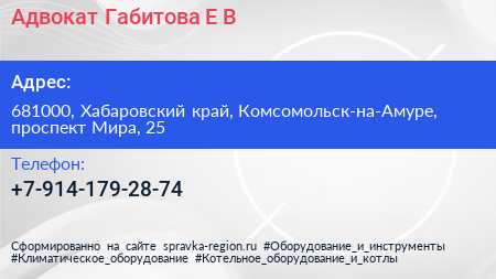 Адвокат Габитова Е.В. по адресу 681000, Хабаровский край, Комсомольск-на-Амуре, проспект Мира, 25 в дальнейшем Организация, размещена в следующих категориях: