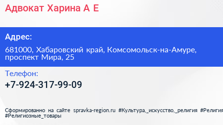 Адвокат Харина А.Е. по адресу 681000, Хабаровский край, Комсомольск-на-Амуре, проспект Мира, 25 в дальнейшем Организация, размещена в следующих категориях: