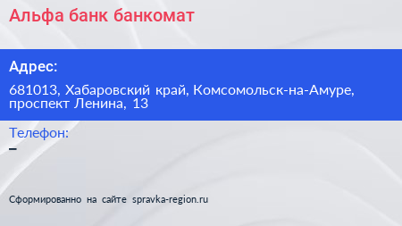 Альфа-банк, банкомат по адресу 681013, Хабаровский край, Комсомольск-на-Амуре, проспект Ленина, 13 в дальнейшем Организация, размещена в следующих категориях: