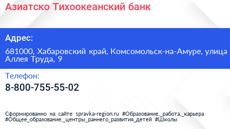 Азиатско-Тихоокеанский банк по адресу 681000, Хабаровский край, Комсомольск-на-Амуре, улица Аллея Труда, 9 в дальнейшем Организация, размещена в следующих категориях: