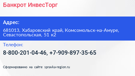Банкрот-ИнвесТорг по адресу 681013, Хабаровский край, Комсомольск-на-Амуре, Севастопольская, 51 к2 в дальнейшем Организация, размещена в следующих категориях: