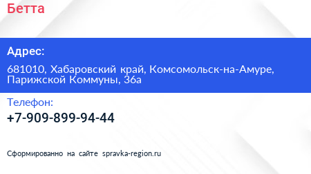 Бетта по адресу 681010, Хабаровский край, Комсомольск-на-Амуре, Парижской Коммуны, 36а в дальнейшем Организация, размещена в следующих категориях: