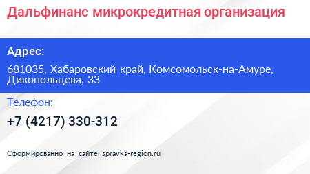 Дальфинанс, микрокредитная организация по адресу 681035, Хабаровский край, Комсомольск-на-Амуре, Дикопольцева, 33 в дальнейшем Организация, размещена в следующих категориях: