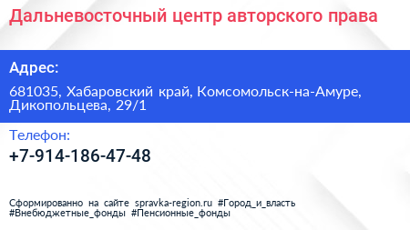 Дальневосточный центр авторского права по адресу 681035, Хабаровский край, Комсомольск-на-Амуре, Дикопольцева, 29/1 в дальнейшем Организация, размещена в следующих категориях:
