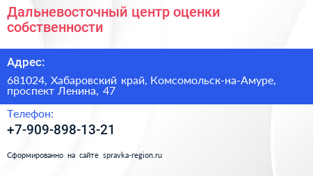 Дальневосточный центр оценки собственности по адресу 681024, Хабаровский край, Комсомольск-на-Амуре, проспект Ленина, 47 в дальнейшем Организация, размещена в следующих категориях: