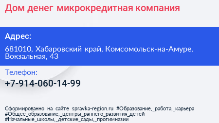 Дом денег, микрокредитная компания по адресу 681010, Хабаровский край, Комсомольск-на-Амуре, Вокзальная, 43 в дальнейшем Организация, размещена в следующих категориях: