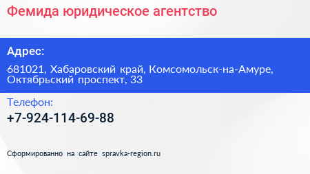 Фемида, юридическое агентство по адресу 681021, Хабаровский край, Комсомольск-на-Амуре, Октябрьский проспект, 33 в дальнейшем Организация, размещена в следующих категориях:
