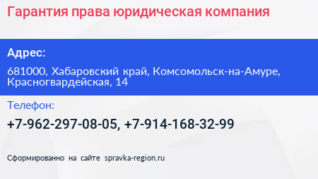 Гарантия права, юридическая компания по адресу 681000, Хабаровский край, Комсомольск-на-Амуре, Красногвардейская, 14 в дальнейшем Организация, размещена в следующих категориях: