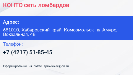 КОНТО, сеть ломбардов по адресу 681010, Хабаровский край, Комсомольск-на-Амуре, Вокзальная, 48 в дальнейшем Организация, размещена в следующих категориях: