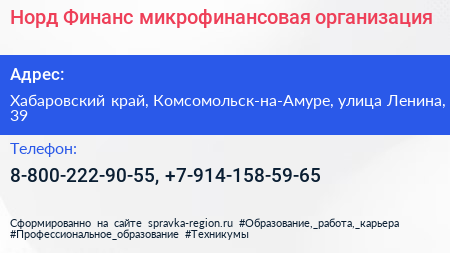 Норд Финанс, микрофинансовая организация по адресу Хабаровский край, Комсомольск-на-Амуре, улица Ленина, 39 в дальнейшем Организация, размещена в следующих категориях: