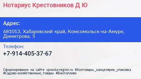 Нотариус Крестовников Д.Ю. по адресу 681013, Хабаровский край, Комсомольск-на-Амуре, Димитрова, 5 в дальнейшем Организация, размещена в следующих категориях: