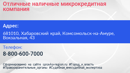 Отличные наличные, микрокредитная компания по адресу 681010, Хабаровский край, Комсомольск-на-Амуре, Вокзальная, 43 в дальнейшем Организация, размещена в следующих категориях: