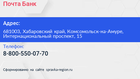 Почта Банк по адресу 681003, Хабаровский край, Комсомольск-на-Амуре, Интернациональный проспект, 15 в дальнейшем Организация, размещена в следующих категориях: