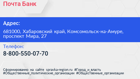 Почта Банк по адресу 681000, Хабаровский край, Комсомольск-на-Амуре, проспект Мира, 27 в дальнейшем Организация, размещена в следующих категориях: