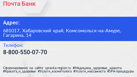 Почта Банк по адресу 681017, Хабаровский край, Комсомольск-на-Амуре, Гагарина, 14 в дальнейшем Организация, размещена в следующих категориях:
