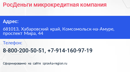 РосДеньги, микрокредитная компания по адресу 681013, Хабаровский край, Комсомольск-на-Амуре, проспект Мира, 44 в дальнейшем Организация, размещена в следующих категориях: