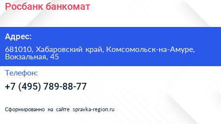 Росбанк, банкомат по адресу 681010, Хабаровский край, Комсомольск-на-Амуре, Вокзальная, 45 в дальнейшем Организация, размещена в следующих категориях: