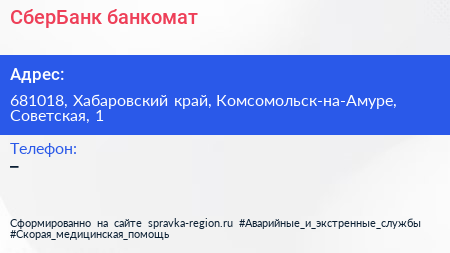 СберБанк, банкомат по адресу 681018, Хабаровский край, Комсомольск-на-Амуре, Советская, 1 в дальнейшем Организация, размещена в следующих категориях: