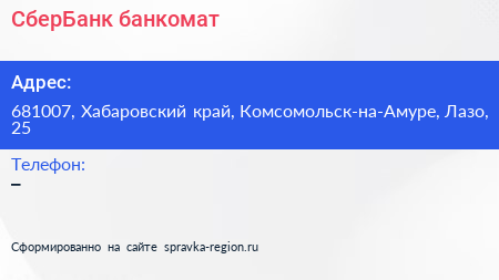 СберБанк, банкомат по адресу 681007, Хабаровский край, Комсомольск-на-Амуре, Лазо, 25 в дальнейшем Организация, размещена в следующих категориях:
