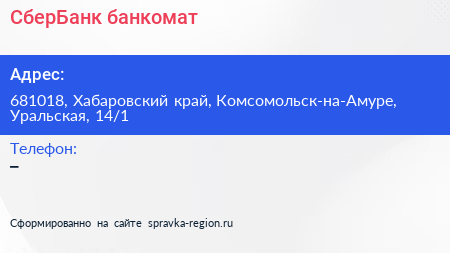 СберБанк, банкомат по адресу 681018, Хабаровский край, Комсомольск-на-Амуре, Уральская, 14/1 в дальнейшем Организация, размещена в следующих категориях:
