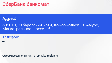 СберБанк, банкомат по адресу 681010, Хабаровский край, Комсомольск-на-Амуре, Магистральное шоссе, 15 в дальнейшем Организация, размещена в следующих категориях: